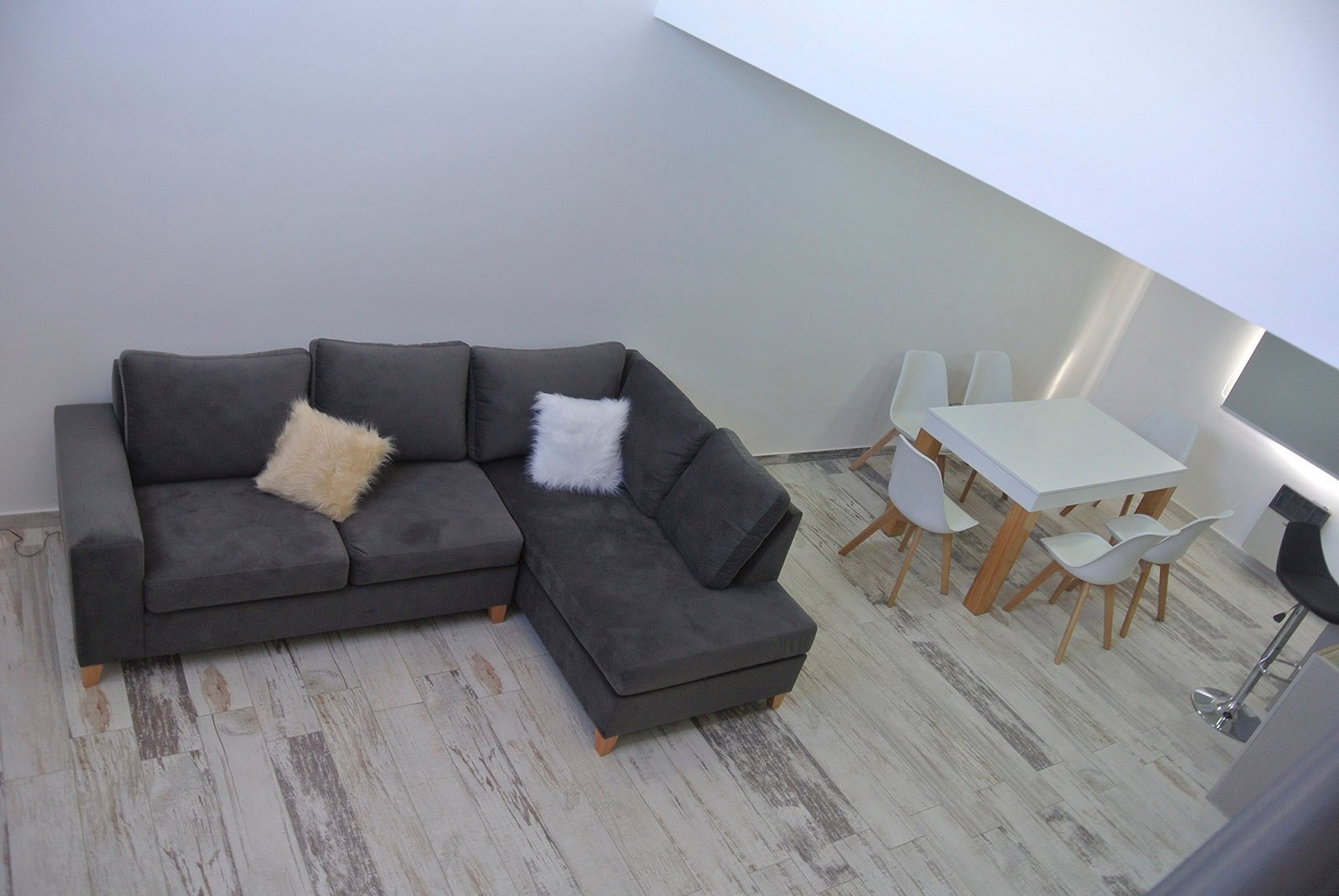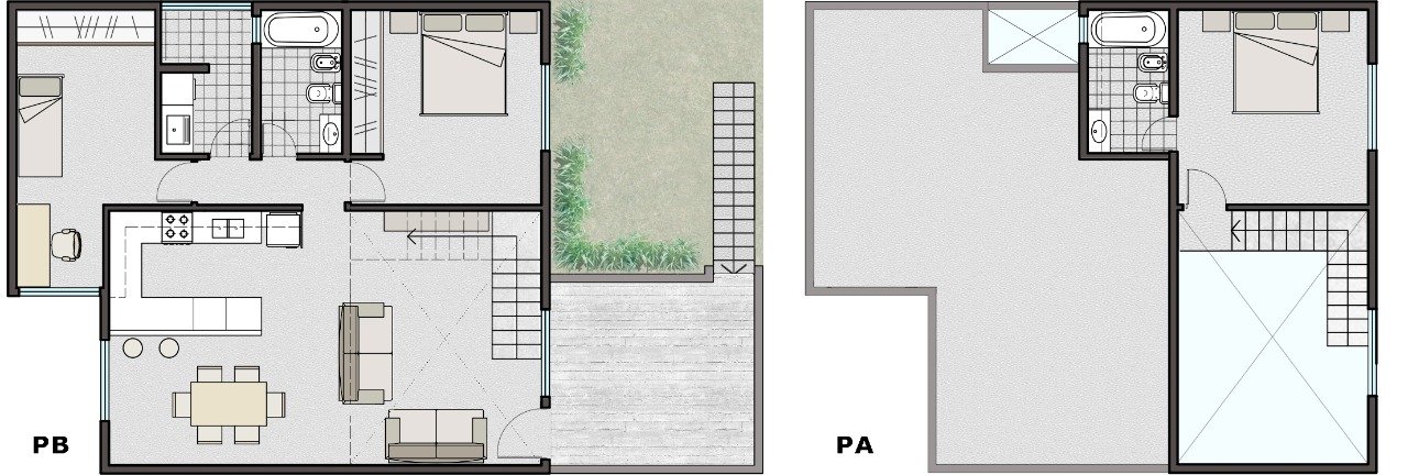 Se priorizó el espacio de living y comedor, generando una doble altura para lograr un espacio amplio y bien iluminado.