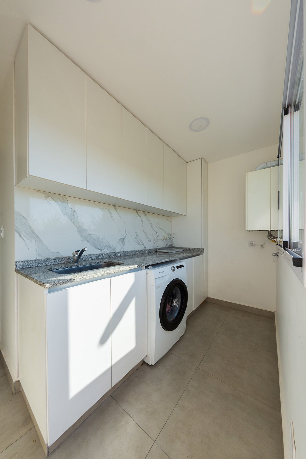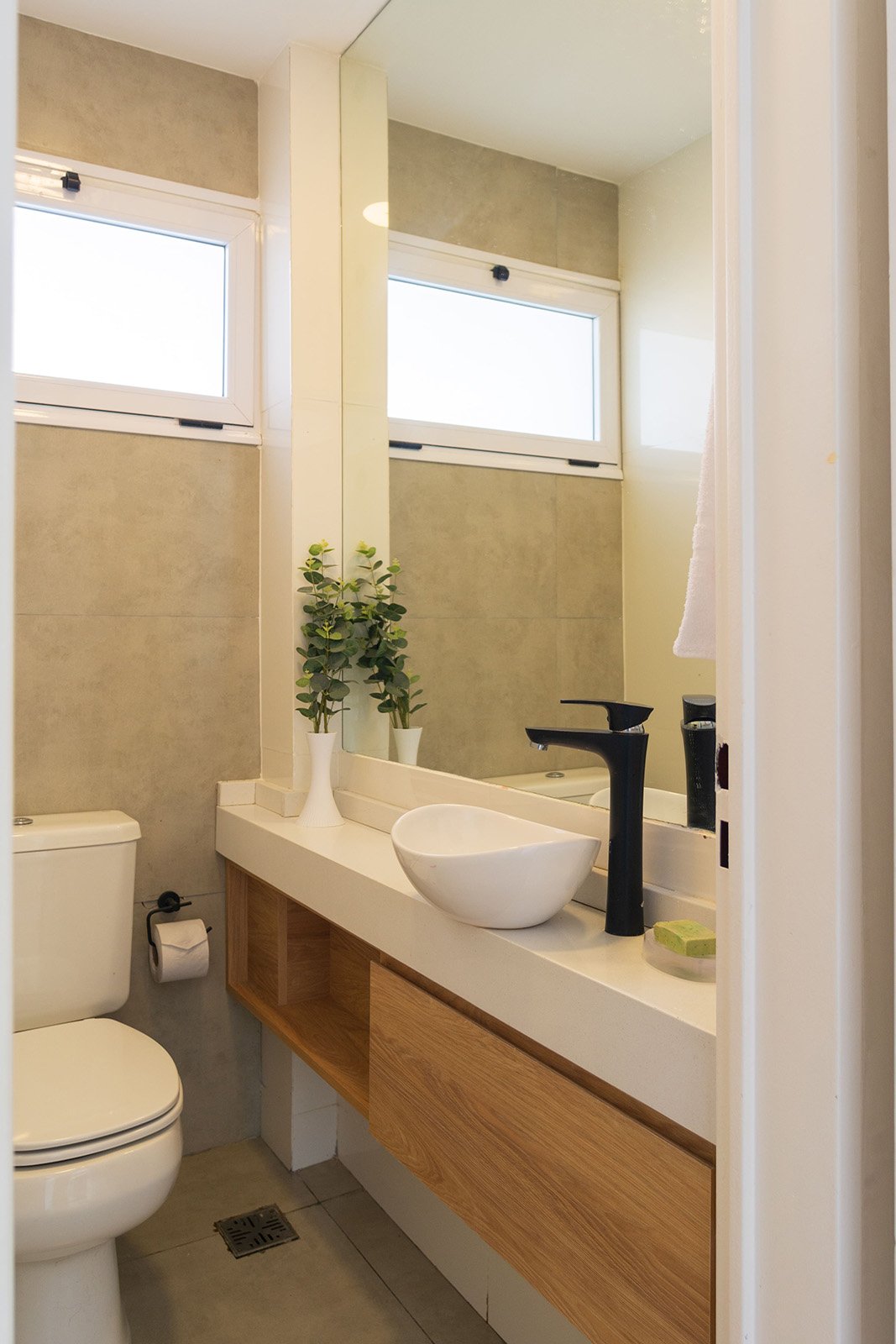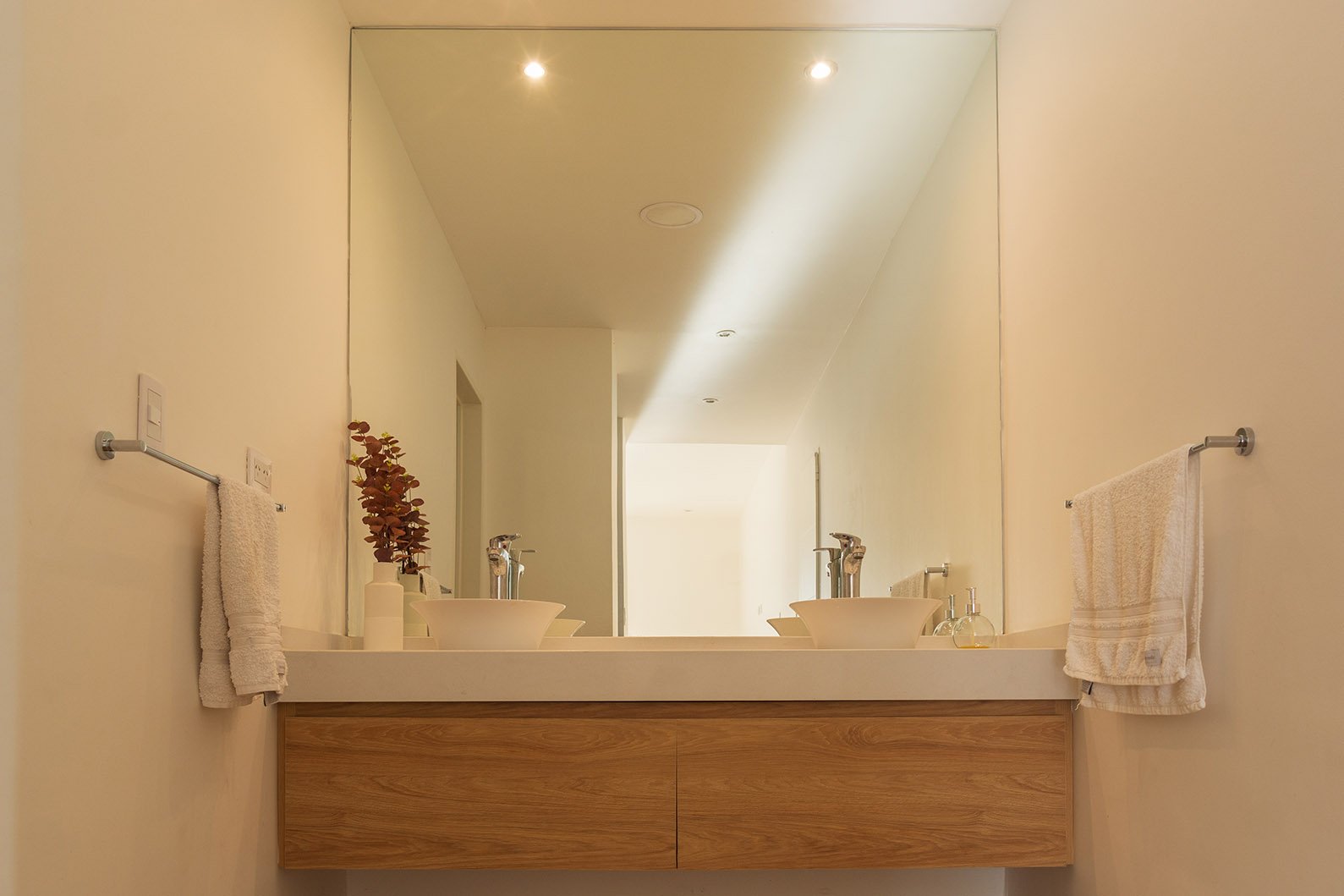 En planta baja se encuentra el área social: cocina, living y comedor. También tiene una habitación que puede utilizarse para recibir huéspedes o como escritorio. El eje del diseño interior se basa en una doble altura sobre el living comedor, genera un amplio espacio, con mucha iluminación. Por otra parte este puente que balconea sobre planta baja permite generar dos espacios bien delimitados en planta alta: un sector para el matrimonio y otro para los hijos. Es así que en planta alta sobre el lado derecho se encuentra una amplia suite con terraza propia y sobre la izquierda dos dormitorios con baño privado.