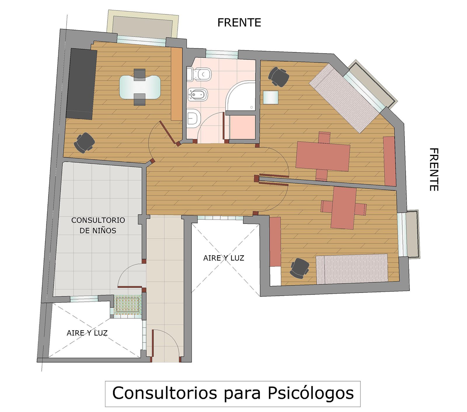 Respecto de los consultorios se diseñó mobiliario exclusivo y se cambió la iluminación. Además se generó un nuevo consultorio para chicos, que también podría utilizarse para talleres infantiles. El mismo se construyó en un ambiente que estaba desaprovechado, ya que se utilizaba como baulera.