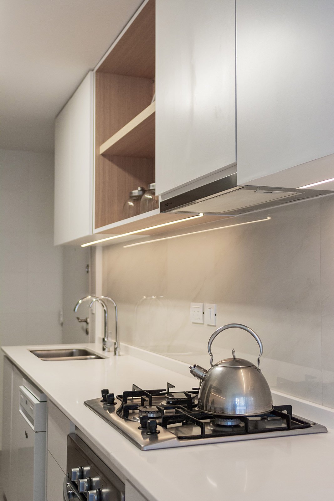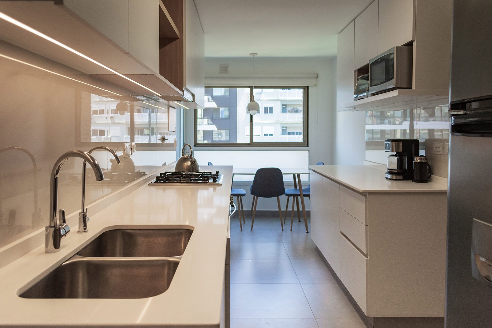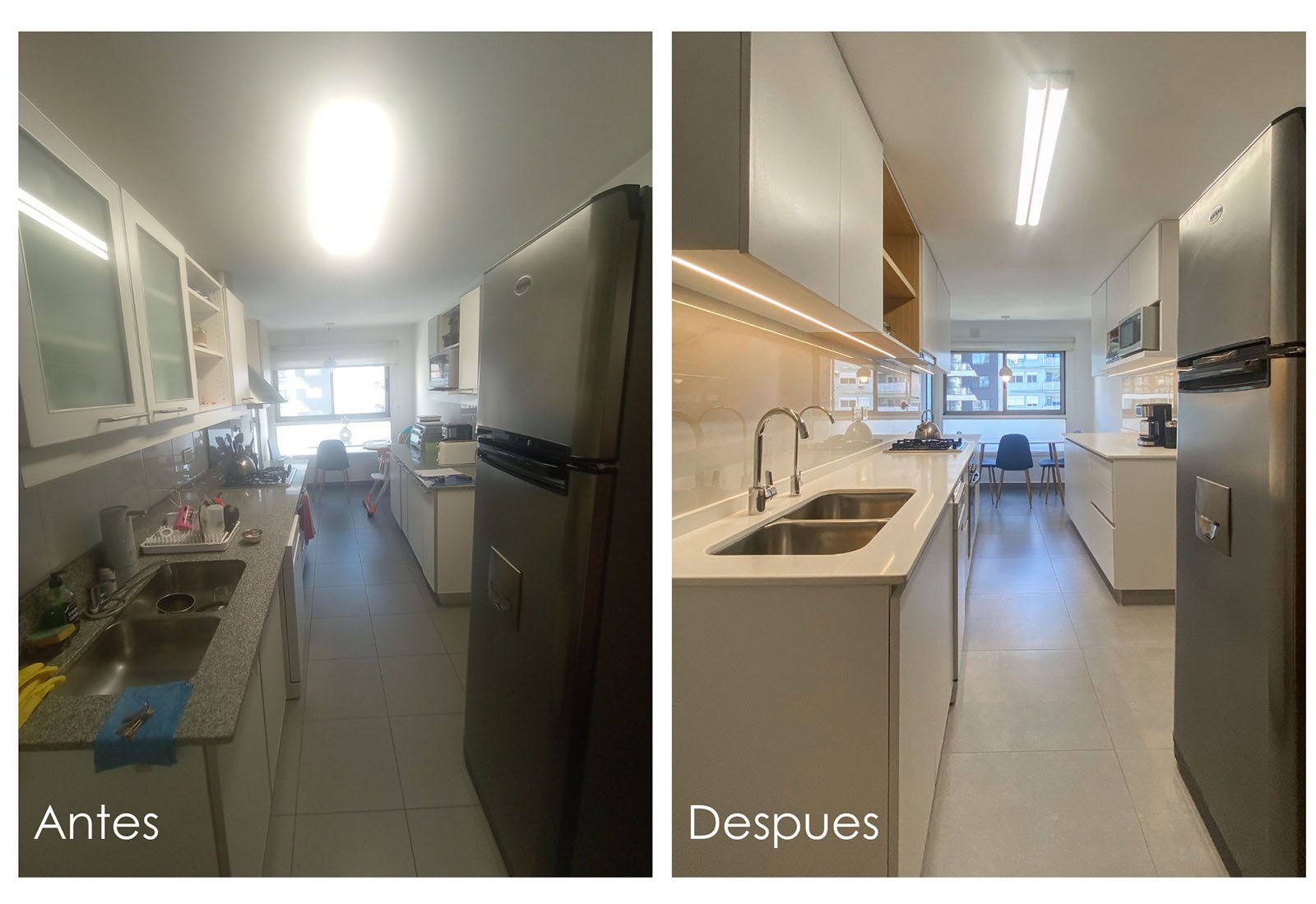 En la cocina cambiamos la totalidad de los revestimientos, eligiendo colores claros para generar amplitud e iluminación. Se realizó mobiliario y mesadas a medida, ampliando sus dimensiones y mejorando la funcionalidad. Tambien se agregó iluminación de led.