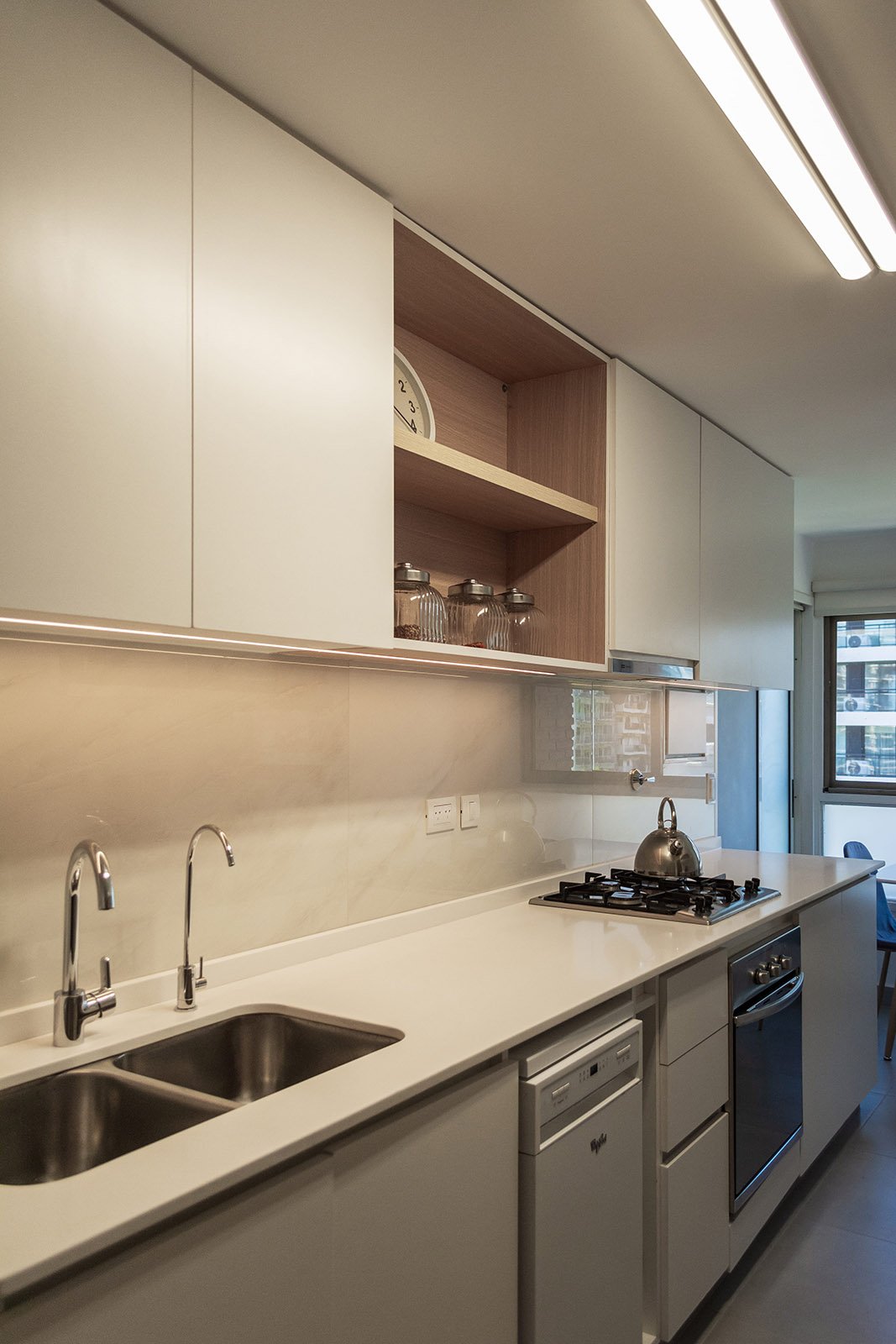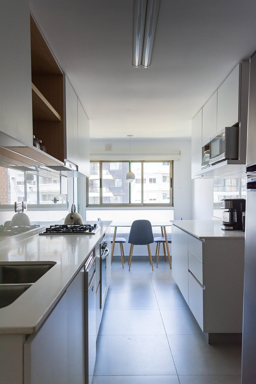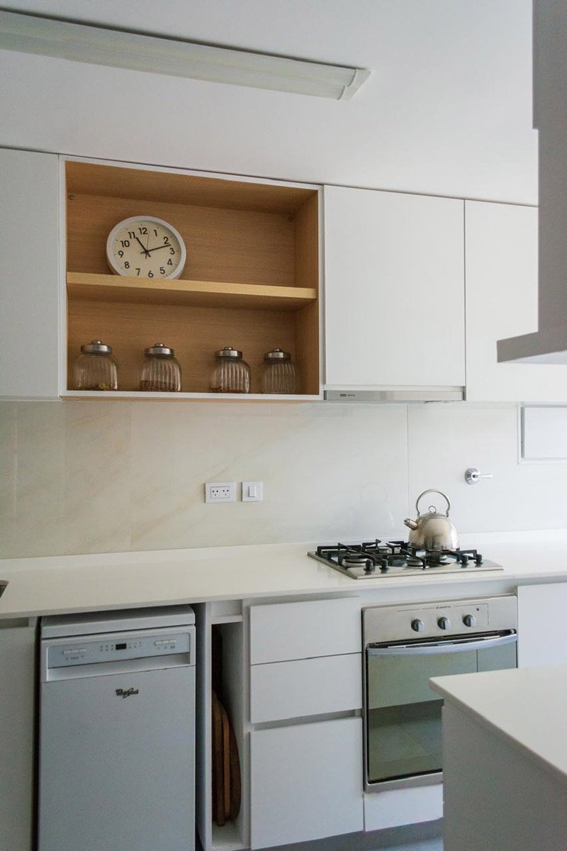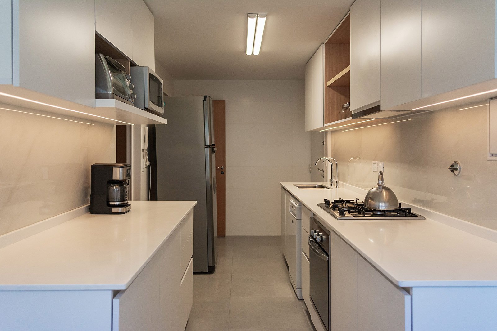 En la cocina cambiamos la totalidad de los revestimientos, eligiendo colores claros para generar amplitud e iluminación. Se realizó mobiliario y mesadas a medida, ampliando sus dimensiones y mejorando la funcionalidad. Tambien se agregó iluminación de led.