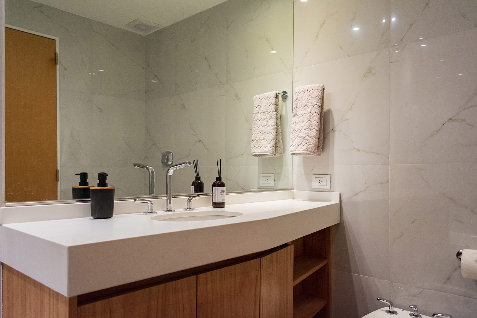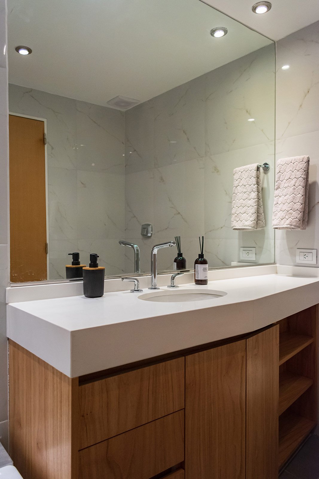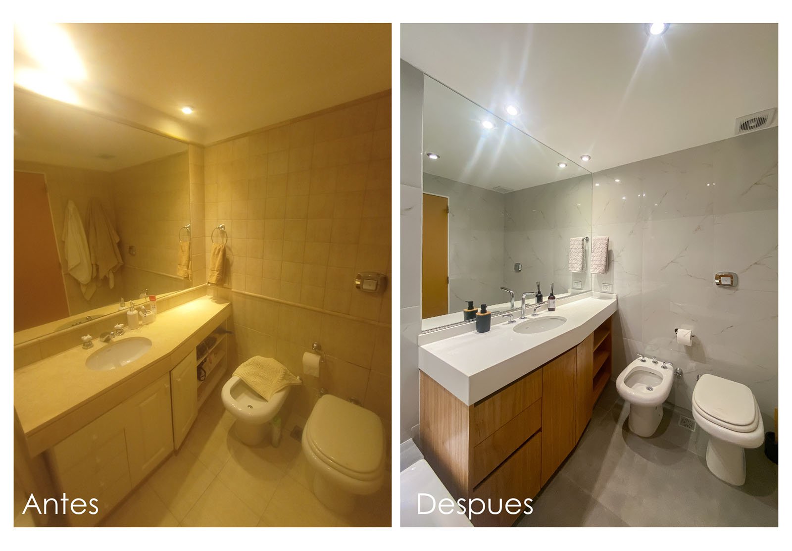 En los baños se cambiaron los revestimientos y se realizó mobiliario y mesadas a medida. Se optó por un diseño moderno y minimalista. Se agregaron detalles en madera para generar calidez