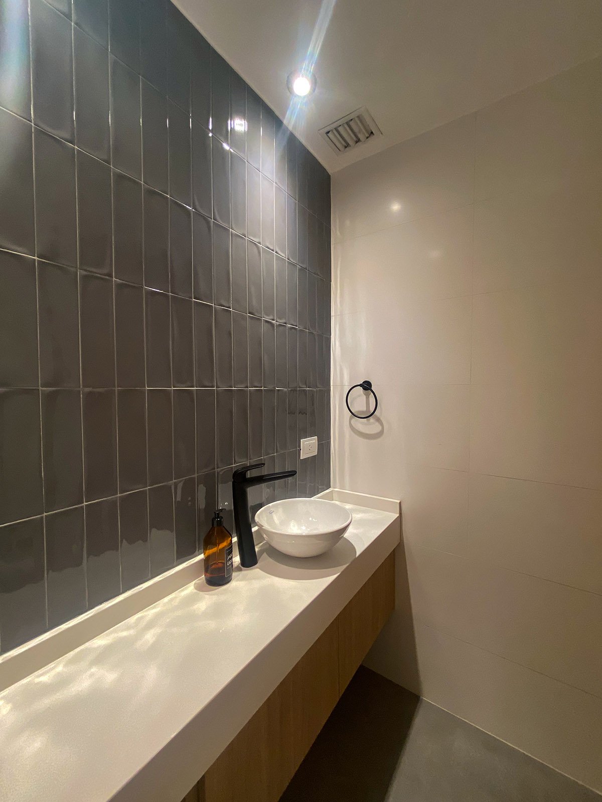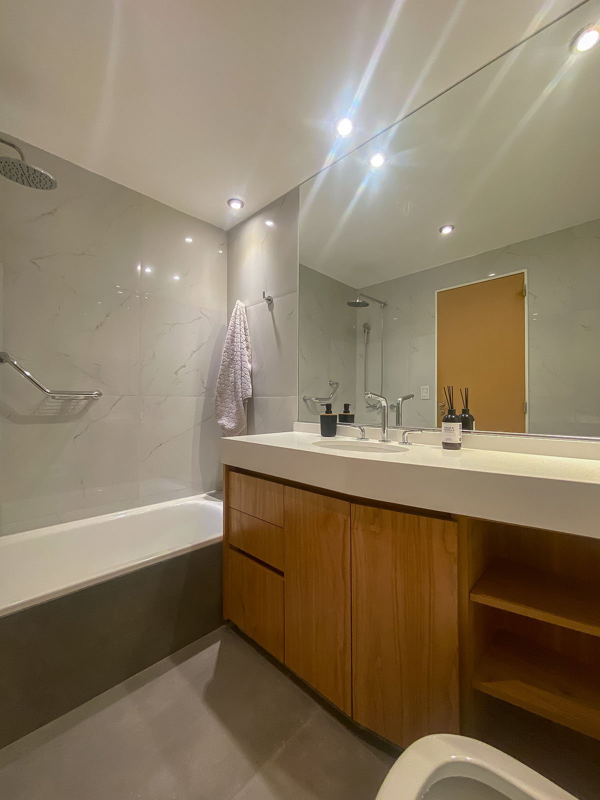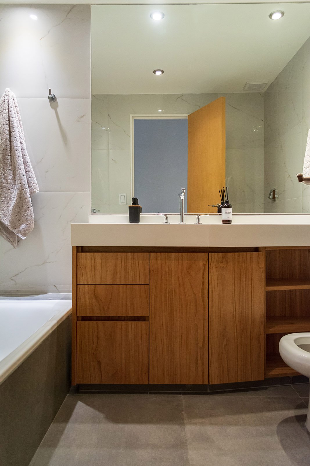 En los baños se cambiaron los revestimientos y se realizó mobiliario y mesadas a medida. Se optó por un diseño moderno y minimalista. Se agregaron detalles en madera para generar calidez